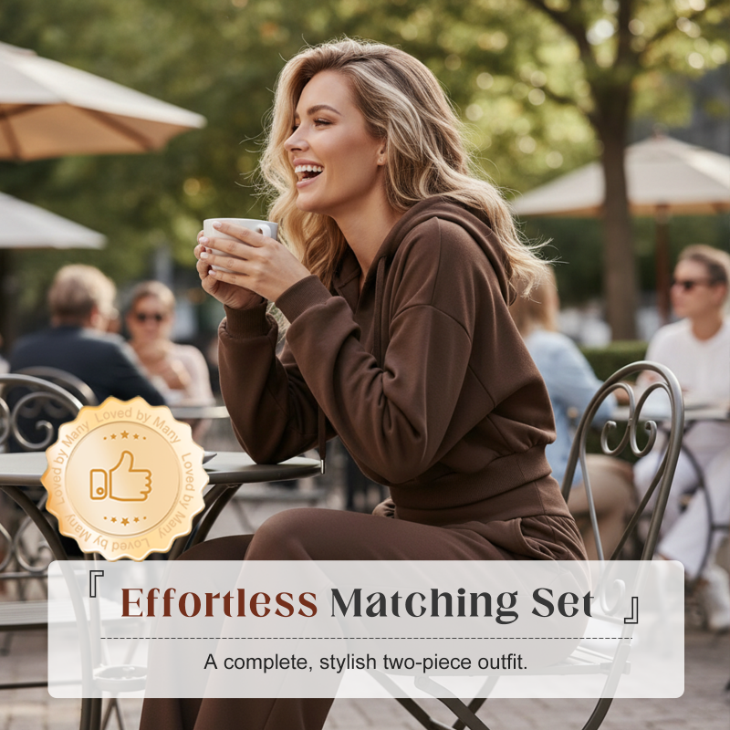 Trendiger Cropped-Hoodie – Dieser Hoodie besticht durch seine moderne, kurze Länge und den einzigartigen V-Ausschnitt, der ihm einen Hauch von zeitgenössischem Stil verleiht. Er harmoniert perfekt mit der High-Waist-Hose und sorgt für eine ausgewogene und modische Silhouette.
