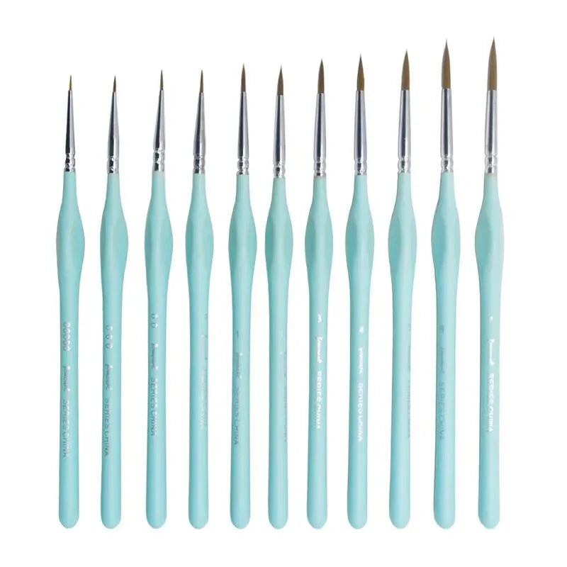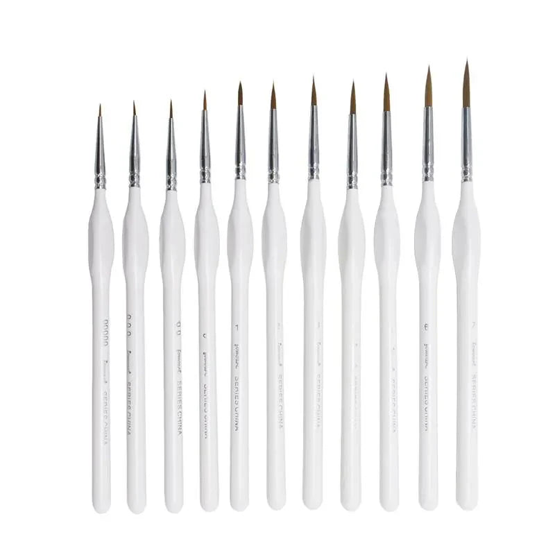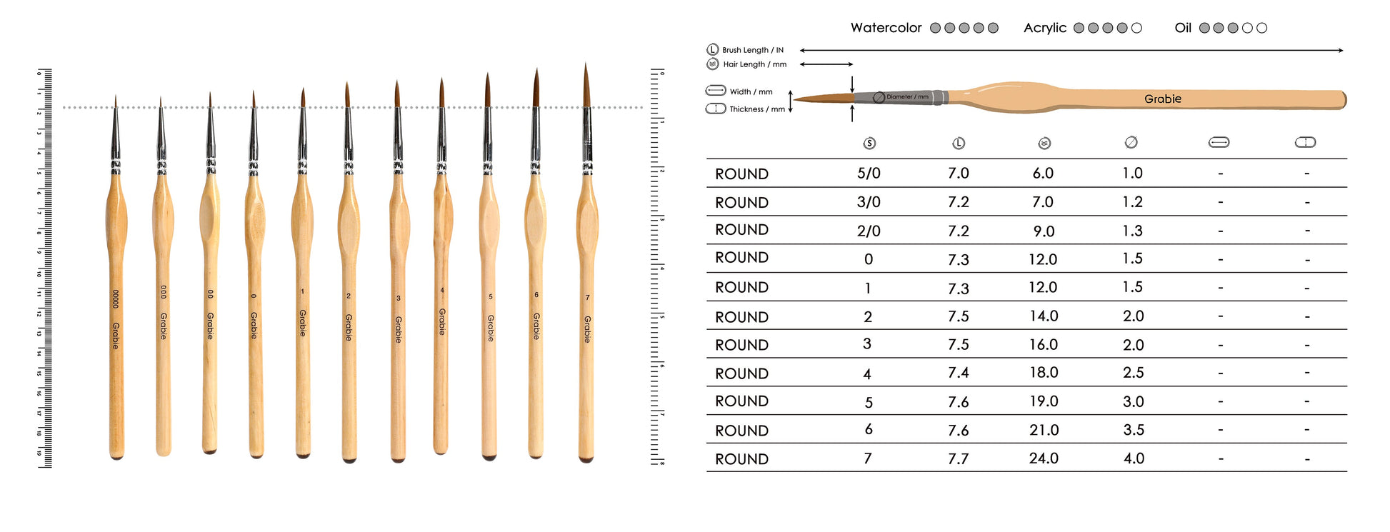 Diese Linie bietet eine große Auswahl an Größen (5/0, 3/0, 2/0, 0, 1, 2, 3, 4, 5, 6, 7), um den Bedarf eines jeden Malers an Detailpinseln zu decken.