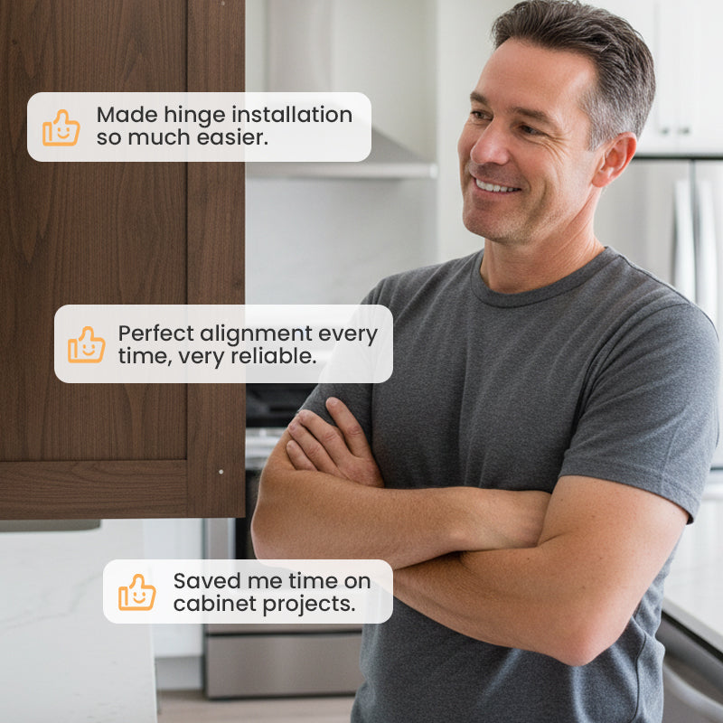 PRÄZISE POSITIONIERUNG – Die Montagehilfe verfügt über deutliche Markierungen für 35-mm-Scharniere und Schraubenlöcher, die eine perfekte Ausrichtung gewährleisten. So entfällt das Rätselraten, schief sitzende Türen werden vermieden und Ihre Schränke erhalten ein professionelles Finish.